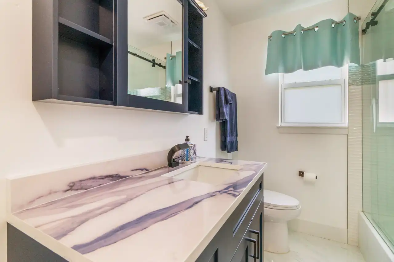 • Guest Bedroom 1: Queen bed, vaulted ceiling with skylight & nearby full bath with tub/shower combo.