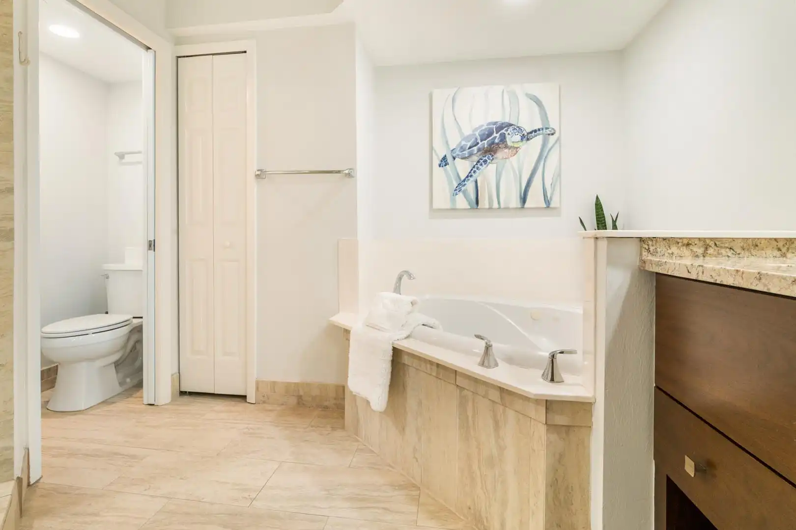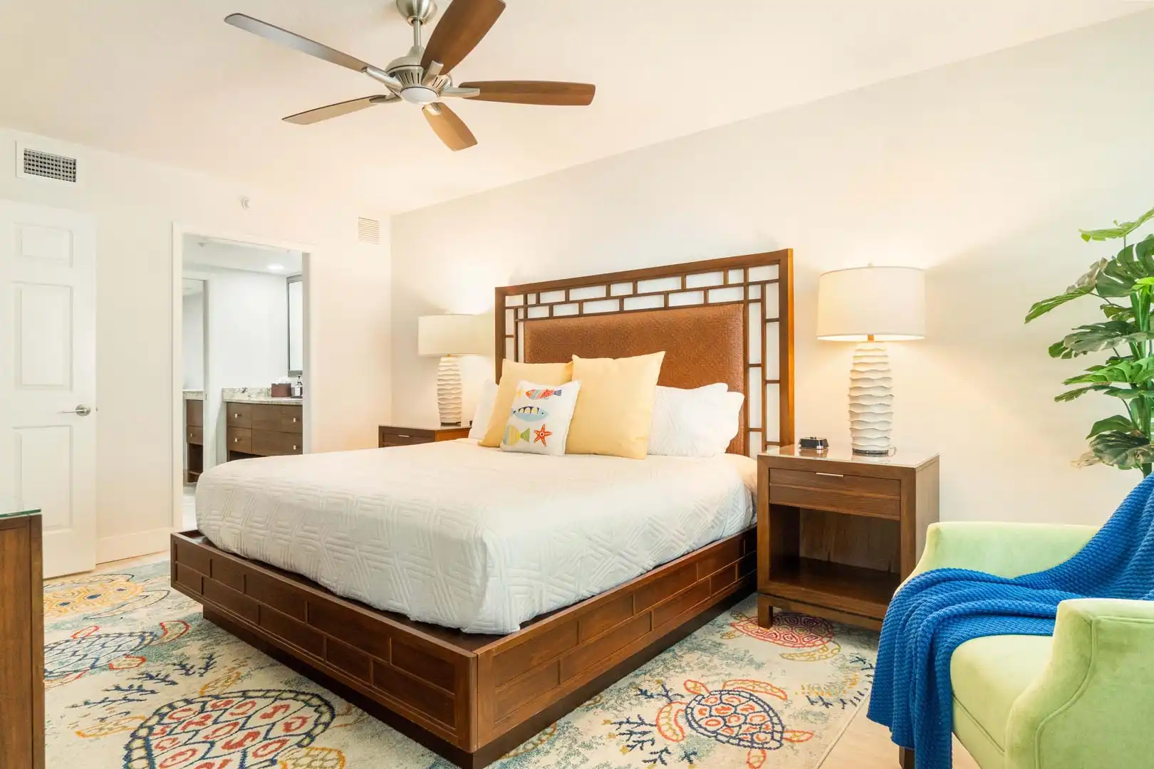 The owner’s suite features: a king bed, an en-suite bathroom with a dual vanity, a walk-in shower, a jetted tub, and a private water closet. You’ll also enjoy direct access to the screened balcony, a walk-in closet, and cable TV for relaxing evenings.