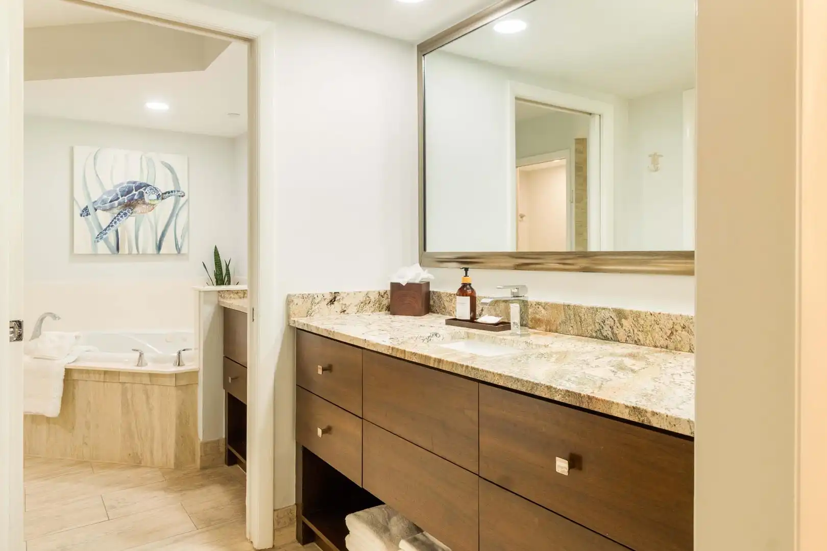Tide & Seek comfortably accommodates up to 6 guests with two beautifully appointed bedrooms and an additional sleeper sofa.