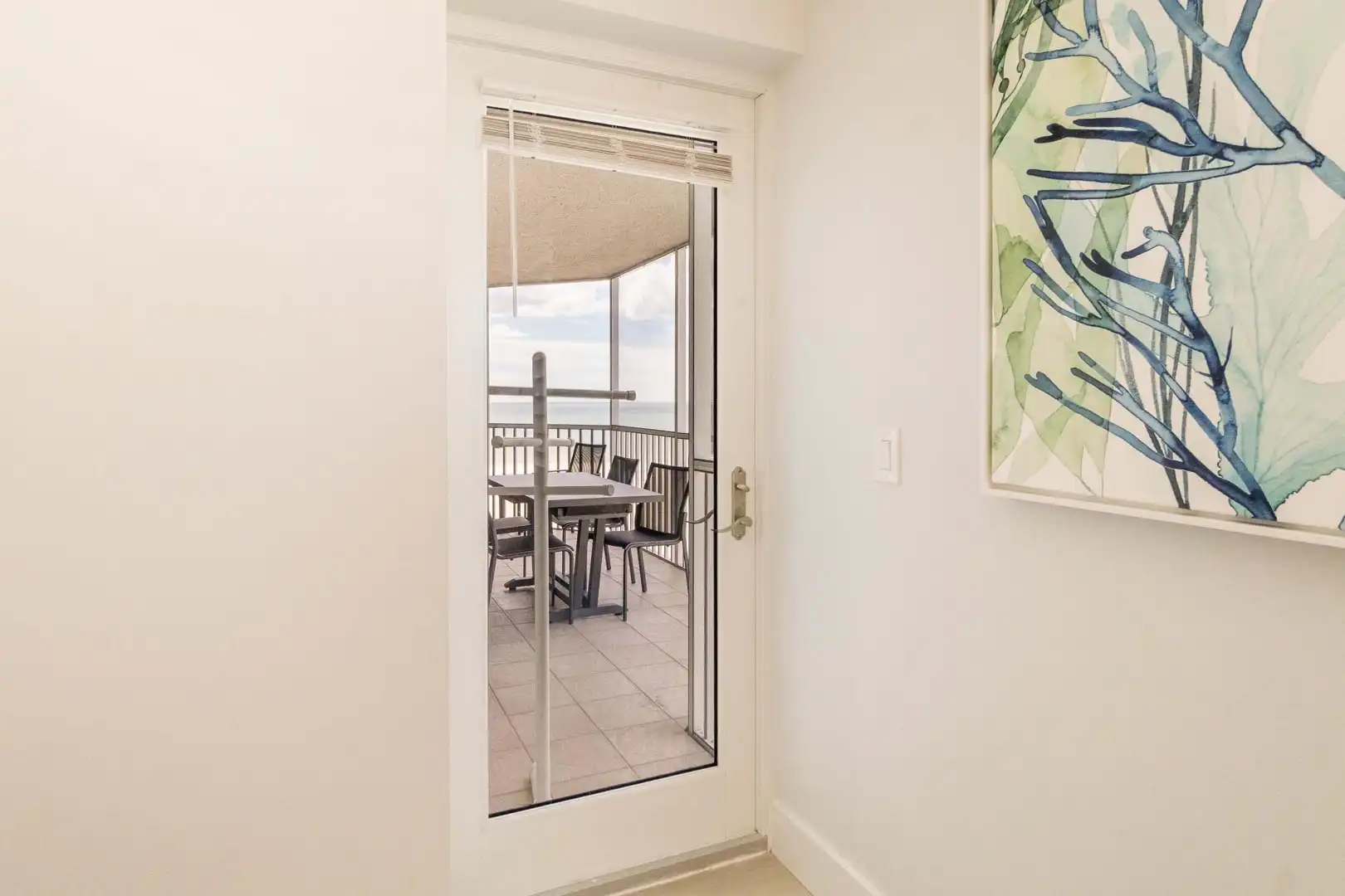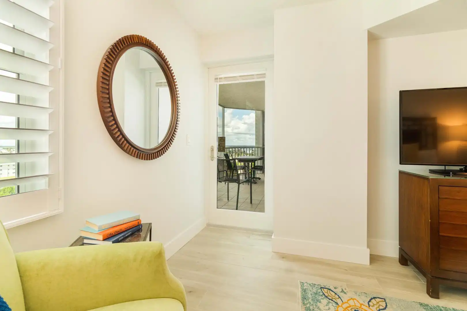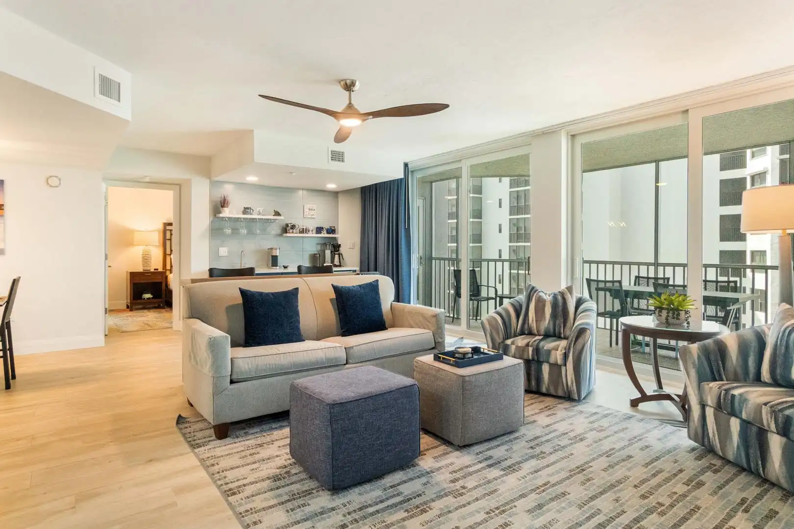 Living room: comfortable sofa that converts to a queen sleeper, two cozy chairs, Smart TV, and sliding doors leading to the screened balcony with angled Gulf views. Books and games are also provided for family fun or quiet downtime.