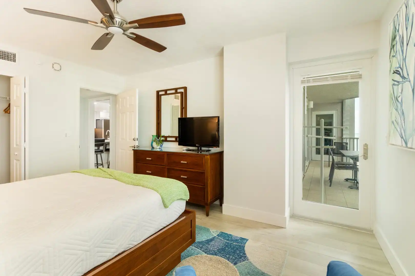 The second bedroom offers: a queen bed with access to the screened balcony and cable TV — a cozy retreat after a day at the beach.