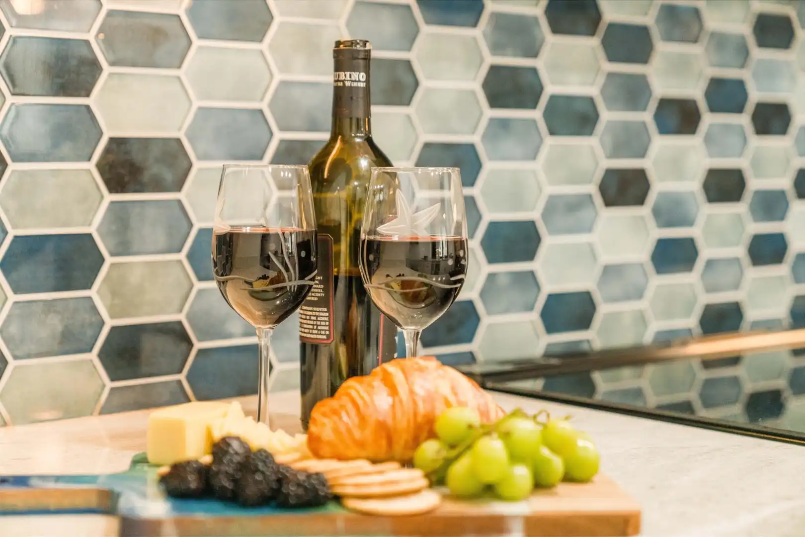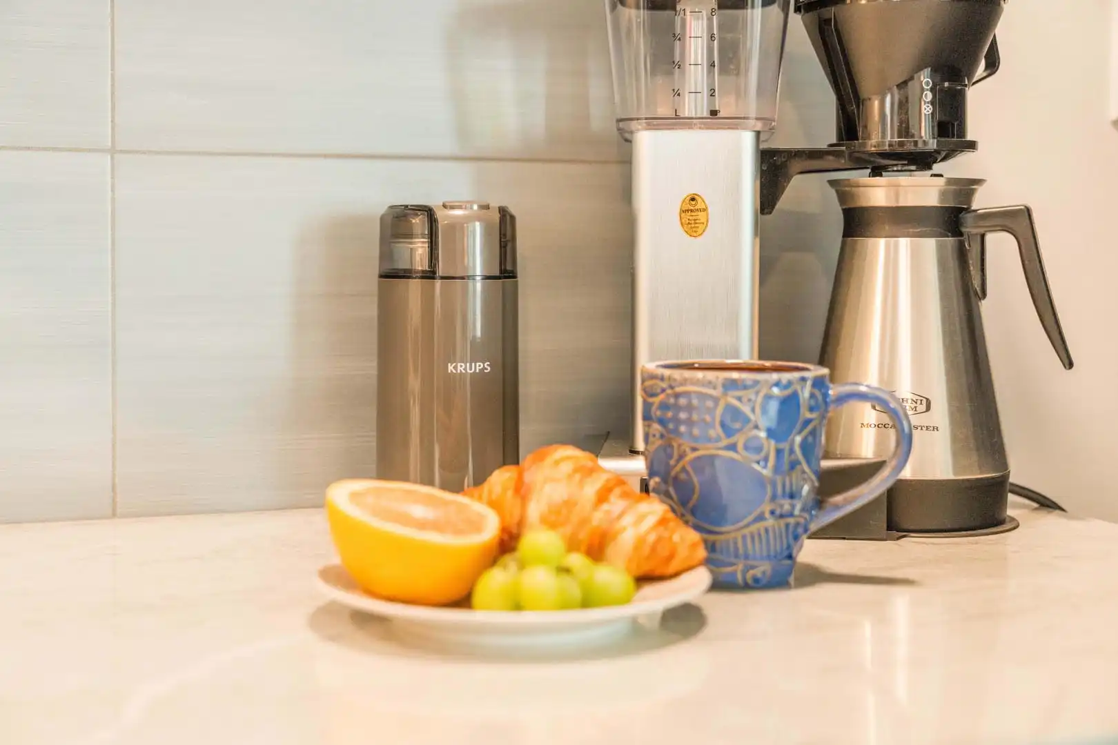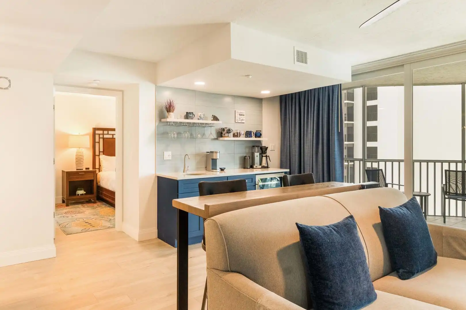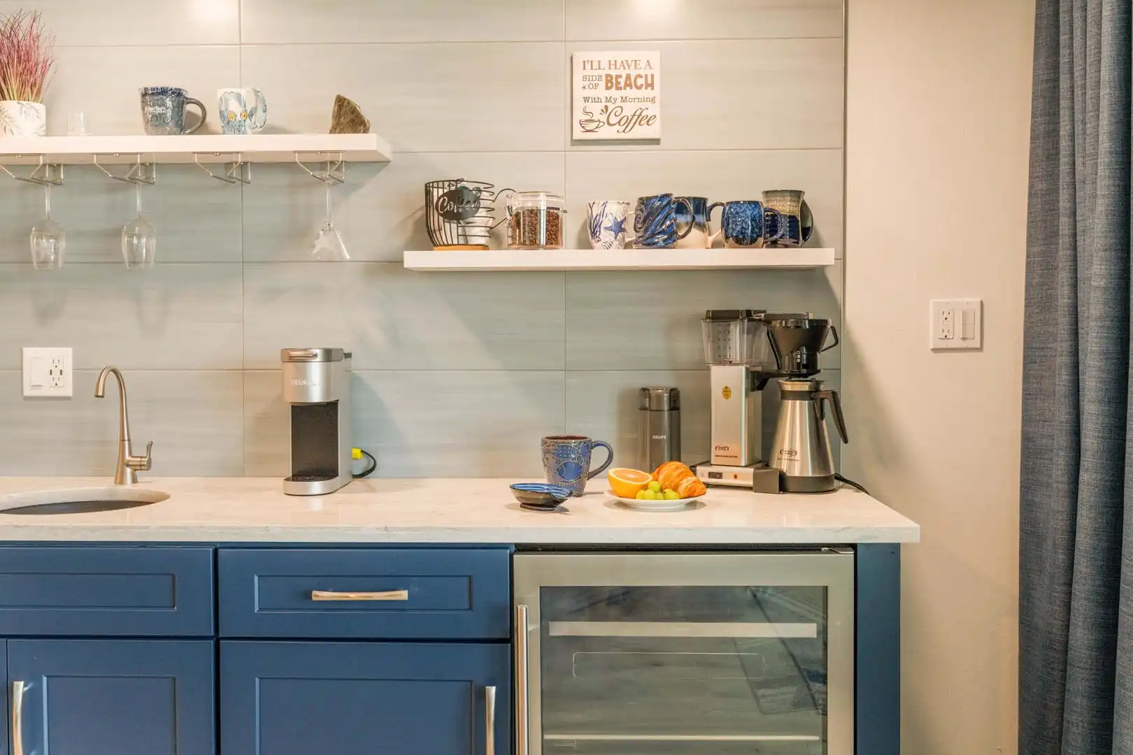 Coffee & wine bar: convenient counter space with pour-over and Keurig coffee options, plus a wine cooler for your favorite evening drink.