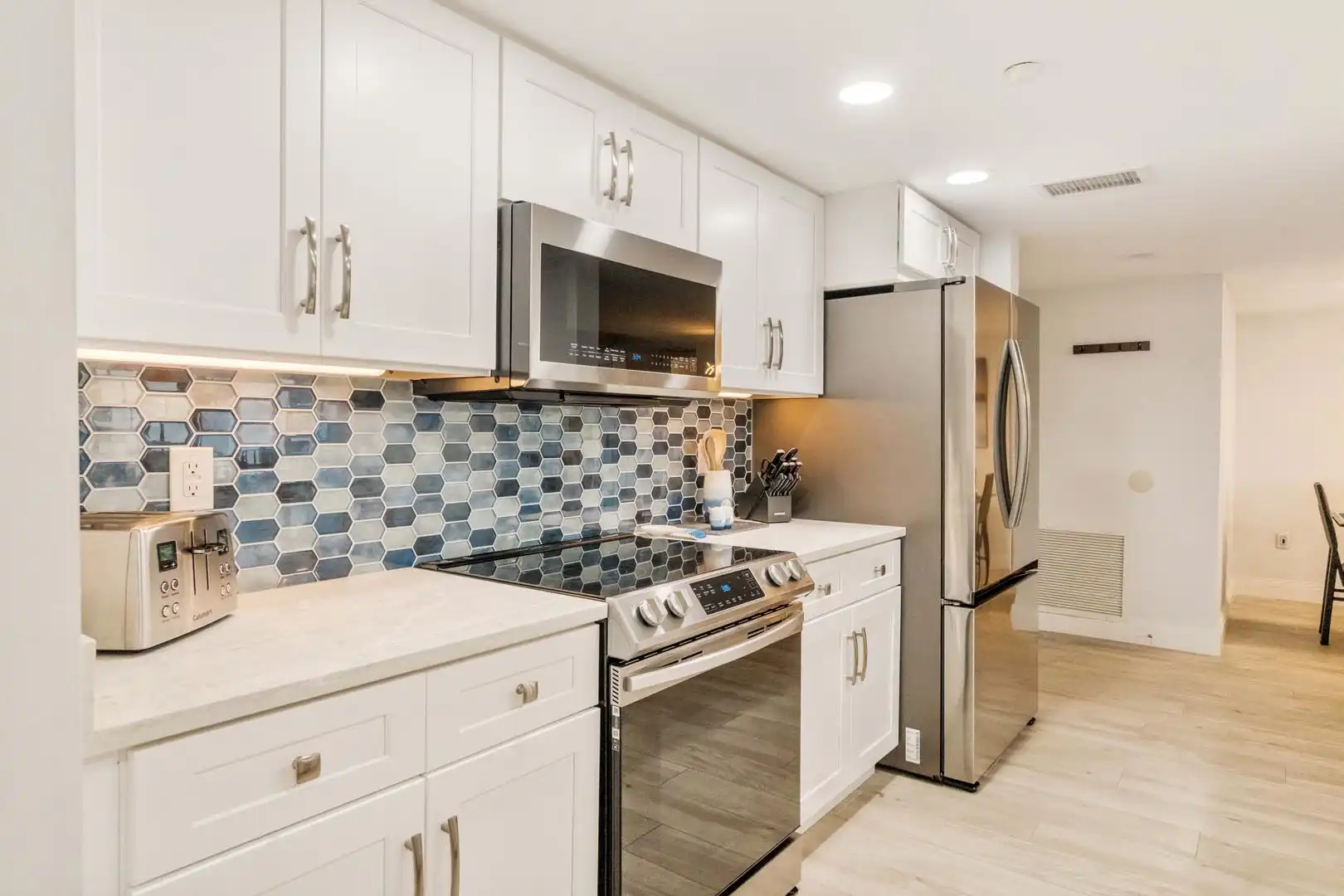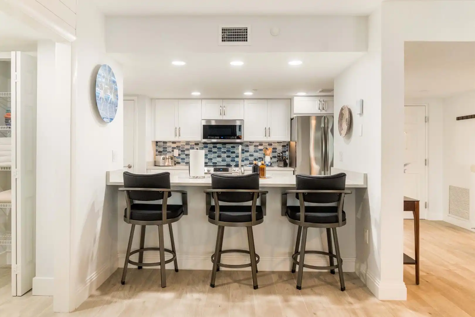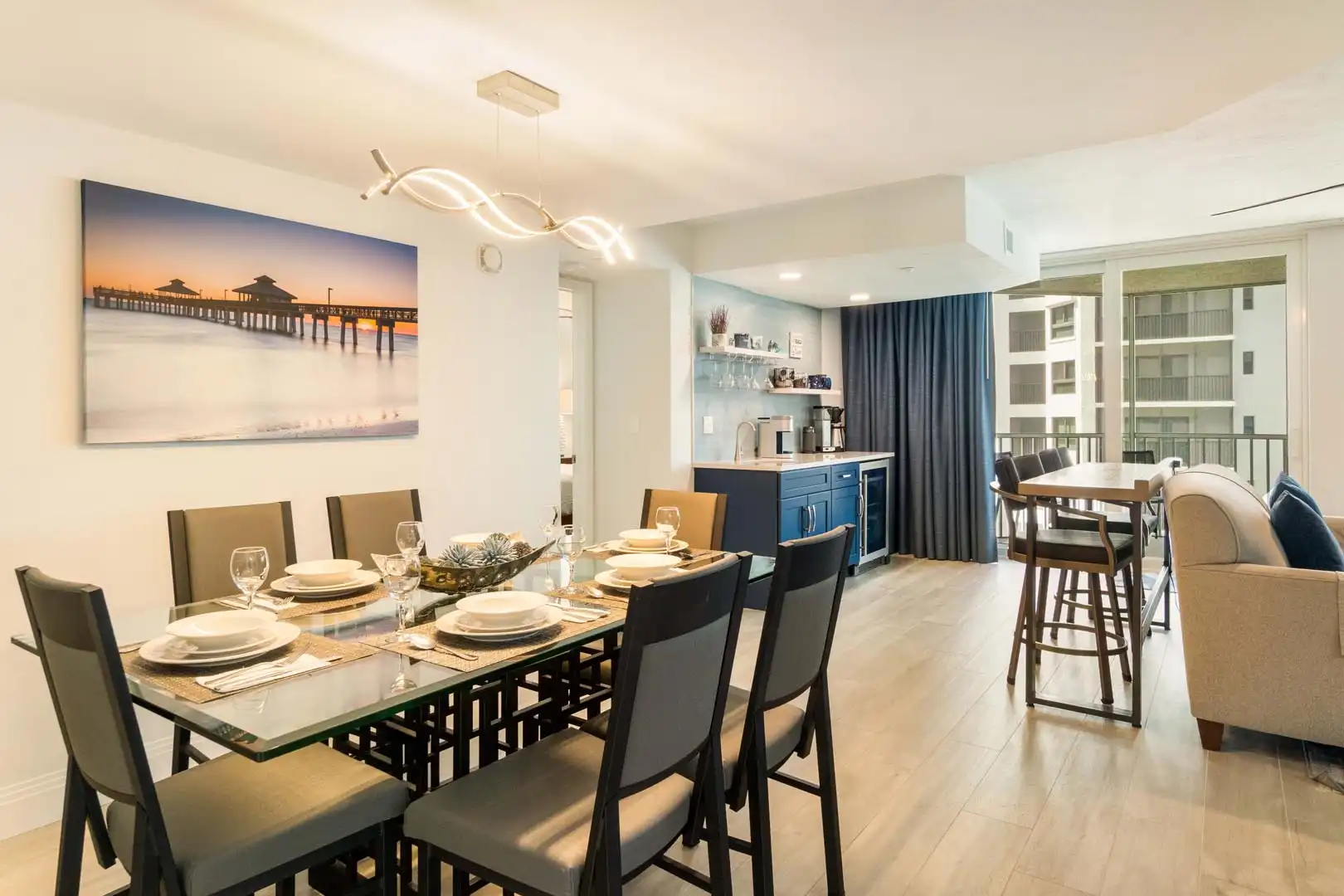 Tide & Seek features an open kitchen and dining area designed for gathering and easy conversation.