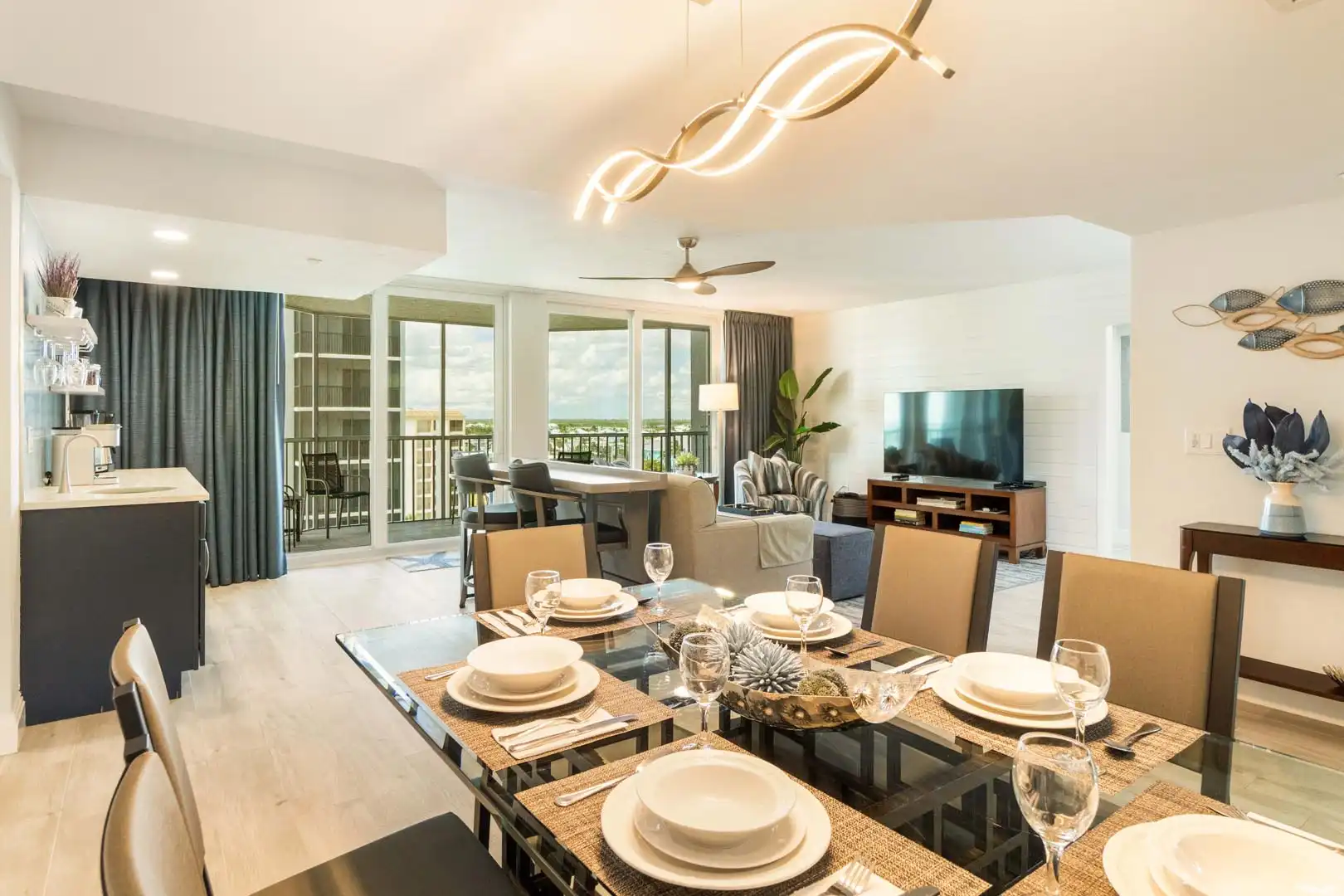 Tide & Seek is a stylish 2BR/2BA condo at Gull Wing Beach Resort, perfectly situated on the peaceful south end of Fort Myers Beach. Sleeping 6, this 8th-floor retreat features an open living space, full kitchen with coffee & wine bar, and a screened balcony with angled Gulf views.