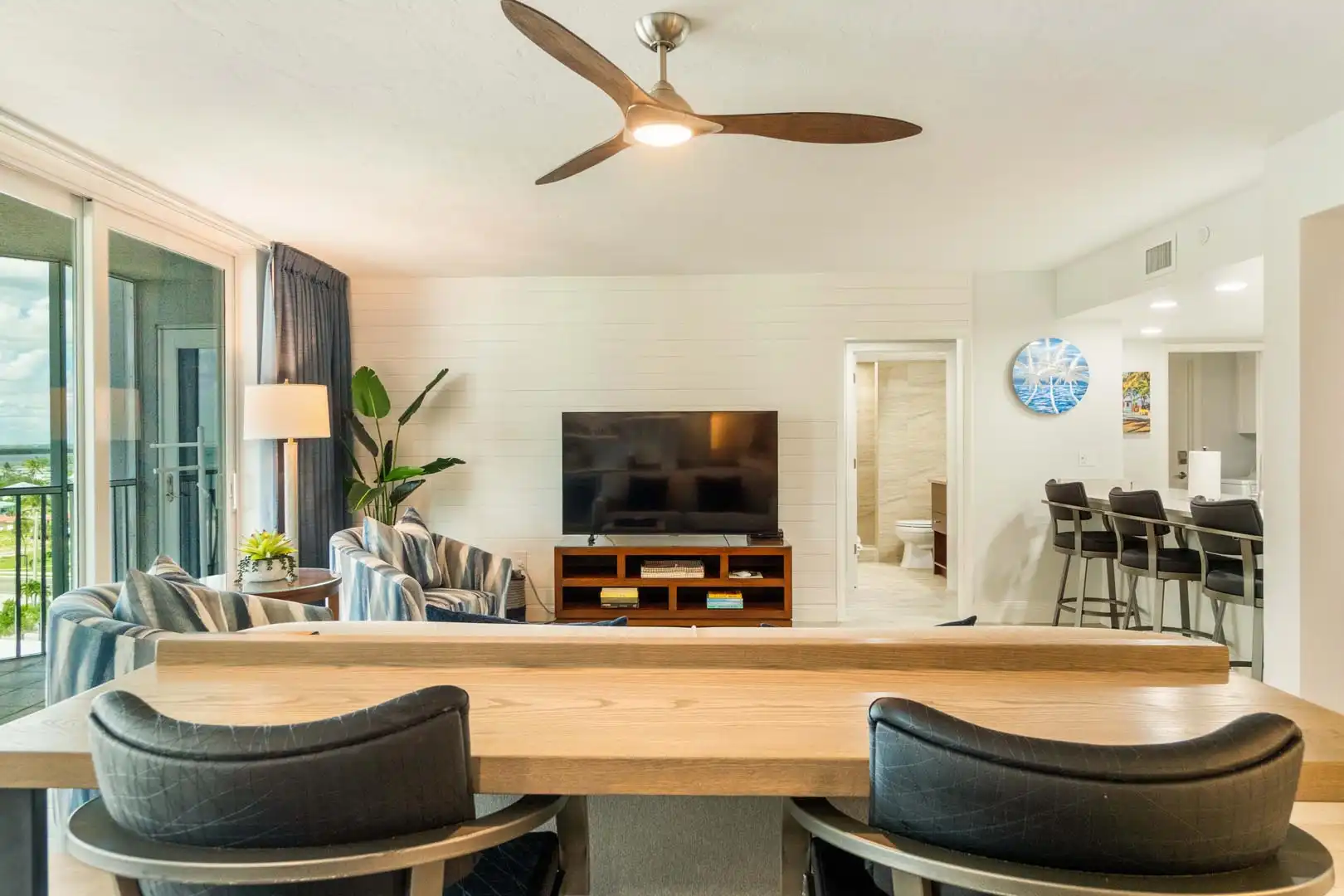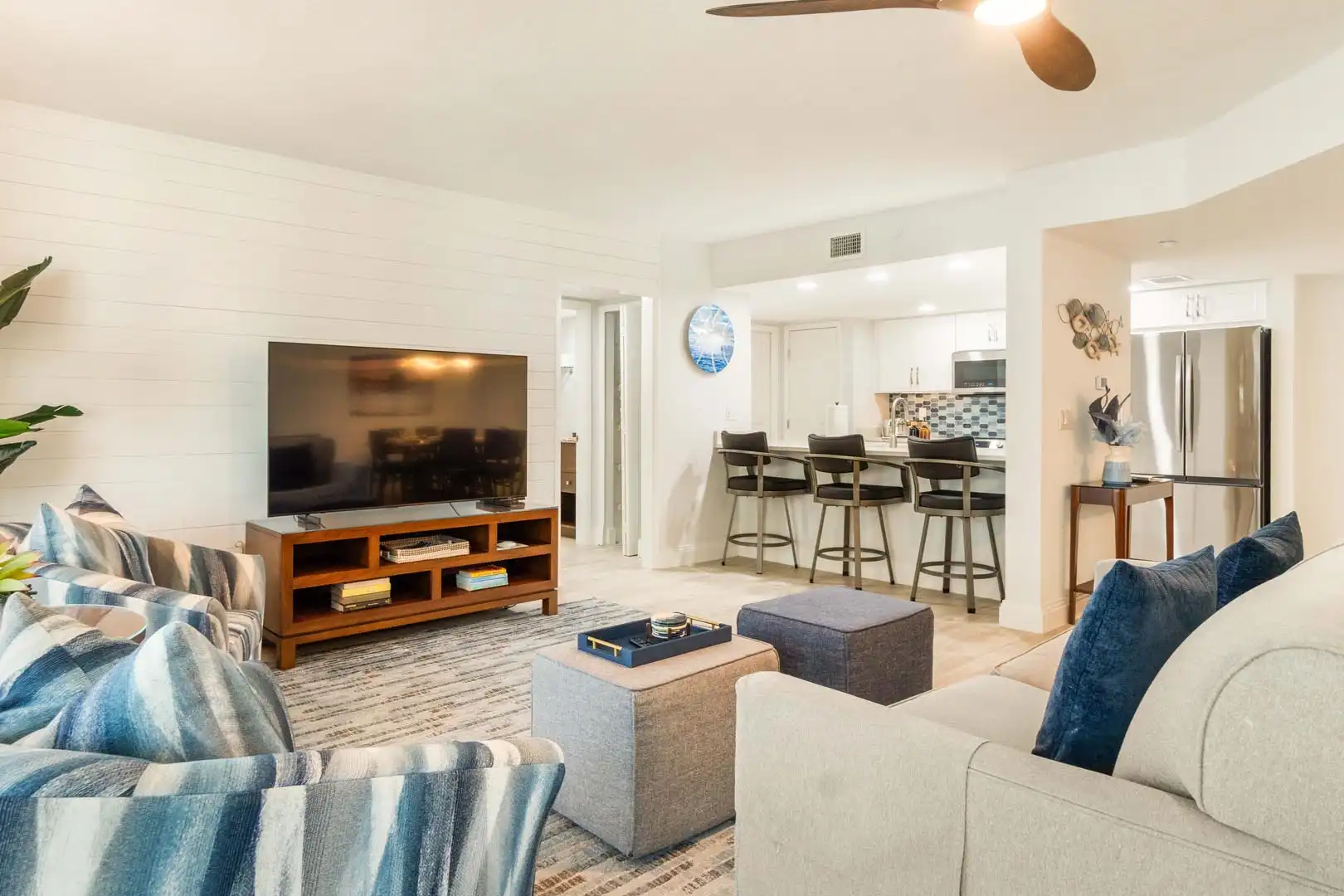Tide & Seek features an open, light-filled living area with coastal charm — perfect for relaxing and connecting after a day at the beach.