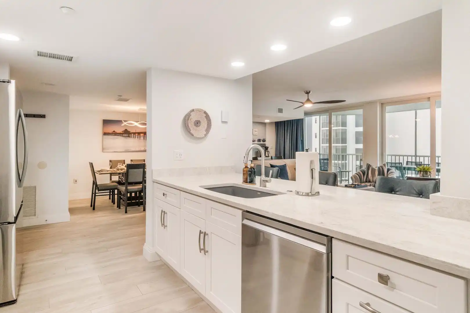 These open spaces flow seamlessly together, connecting the living room, dining area, and kitchen to create a bright and welcoming atmosphere for your stay.